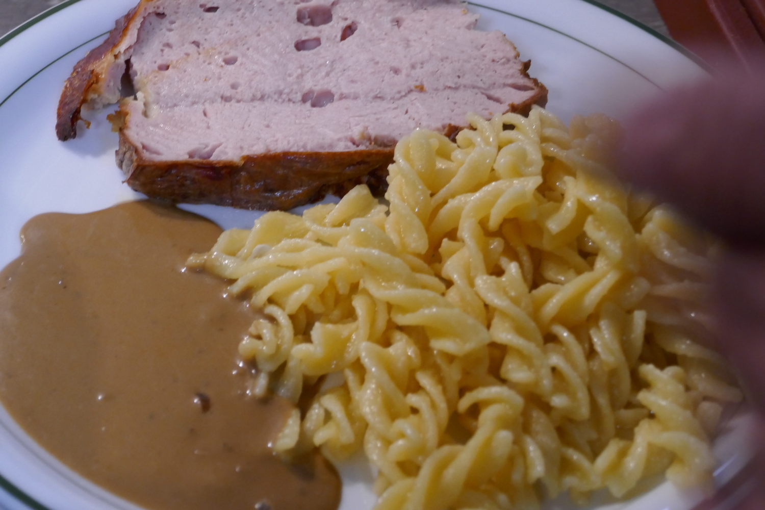 Hackbraten mit "Swiss Army-Spiralnudeln" und einer toll gewürzten Morchel-Steinpilzsuppe.