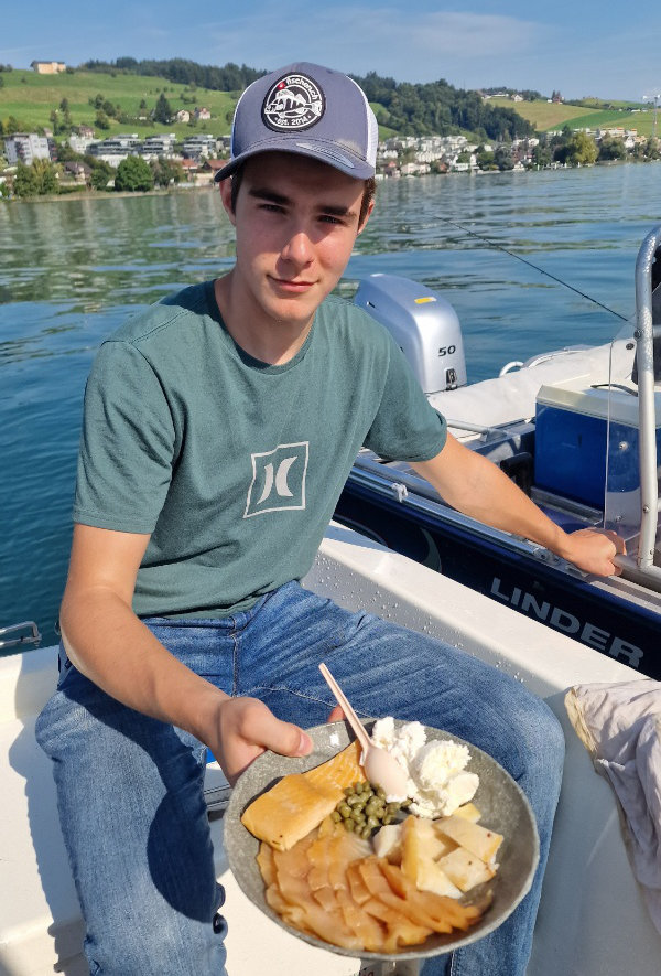 Mit grosser Vorfreude fuhren wir mit 8 Booten auf den See und versuchten, die eine oder andere Balche an die Hegene zu kriegen. Der Hinweis von Arno, "vor dem Fischen die Bremse an der Rolle zu kontrollieren......." wurde schon bald dankbar in Erinnerung gerufen. Die ersten Ruten krümmten sich bis zum Anschlag und die Bremsen surrten! Obwohl die Felchen im Sempacher- und im Vierwaldstättersee "Balchen" genannt werden, ist der Drill einer Ü50er-Balche vom Vierwaldstättersee ein einmaliges Erlebnis und wird den Jungs bestimmt noch lange in Erinnerung bleiben.